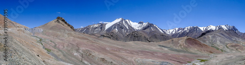 Panoramic view with pastel colors of mountains along high altitude Pamir Highway at Ak Baital pass, Murghab district, Gorno-Badakshan, Tajikistan
