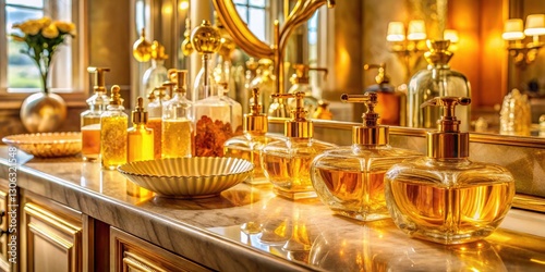 Panoramic Vintage Perfume Bottles Bathroom Photography - Golden Retro Fragrance Collection
