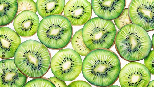 Panoramic Watercolor Kiwi Pattern: Sliced Fruit Art Print, High-Resolution, Vibrant Colors