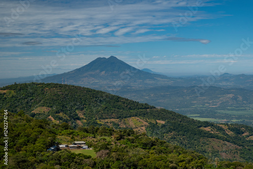 Panoramic wide angle view of San Vicente volcano from a lookout located between small towns Berlin and Alegria in El Salvador. Sunny day, blue sky.