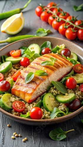 Pan-seared grilled salmon on a bed of mixed greens with sliced avocado and cherry tomatoes