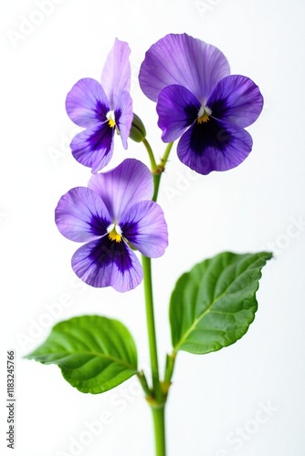 Pansy violet flowers on a lush green stem against a pristine white background, floral, garden, stem