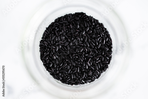 pantry jar with black rice shot from top down perspective as close-up, simple staple ingredients