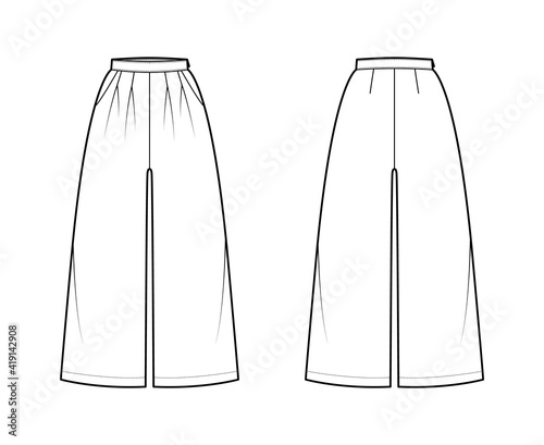 Pants culotte palazzo technical fashion illustration with normal waist, double pleats, calf length, seam pockets, wide legs. Flat trousers template front, back white color. Women men unisex CAD mockup