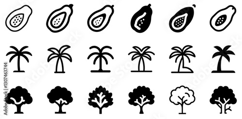 "Papaya, Palm Tree, and Oak Tree Icon Set – Tropical and Nature Vector Symbols"