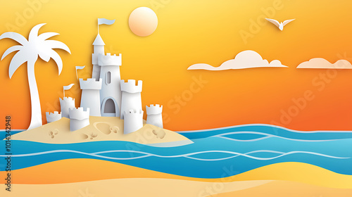 Paper art summer beach background with sand castle in sunset time view paper cut style vector
