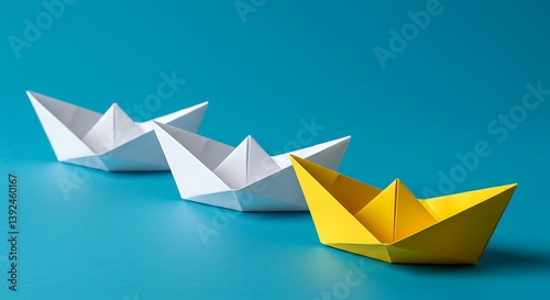Paper boat guides the fleet as new ones join the team. Teamwork, cooperation, leadership, partnership, and participation.