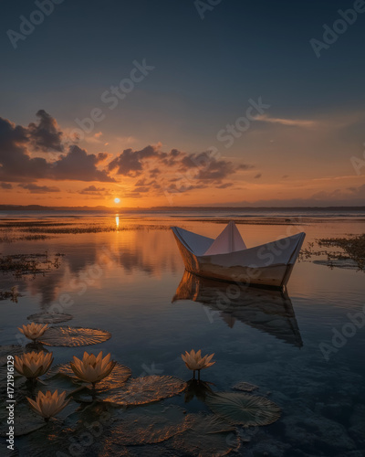 Paper Boat Voyage at Sunset: A paper boat gently floats on the serene water, embraced by the golden hues of a breathtaking sunset, creating a scene of tranquility.