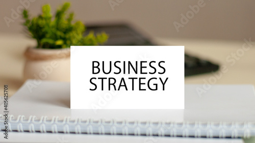 Paper card with text BUSINESS STRATEGY. Calculator, flowers and brown background