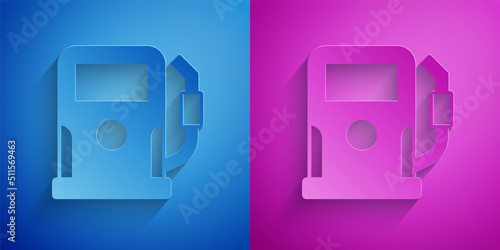 Paper cut Petrol or gas station icon isolated on blue and purple background. Car fuel symbol. Gasoline pump. Paper art style. Vector