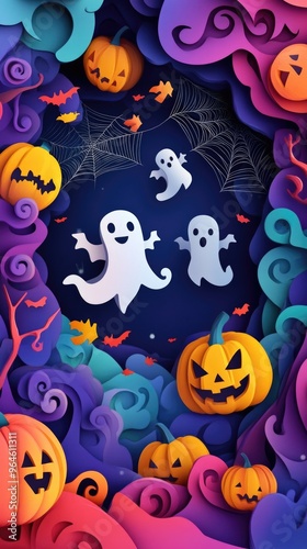 Paper cut style illustration of playful ghosts and pumpkins dancing under the moonlight