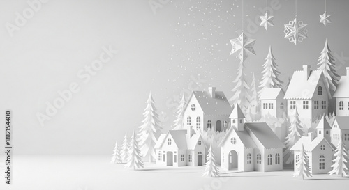 Paper cut winter village scene with houses trees stars and snow in a monochromatic white color palette created with generated ai