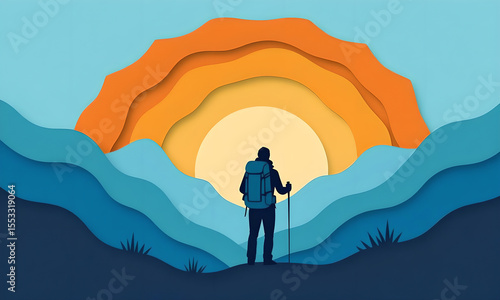 Paper Cutout Hiker Silhouette with Backpack and Mountain Sunrise Backdrop