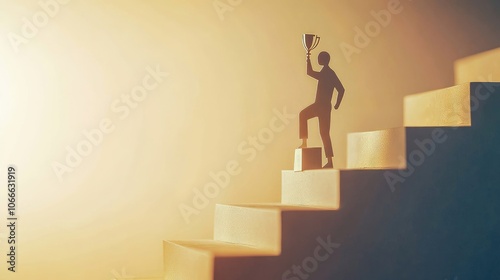Paper cut-out man scaling a set of stairs with a trophy at the top, symbolizing business goals and achievement