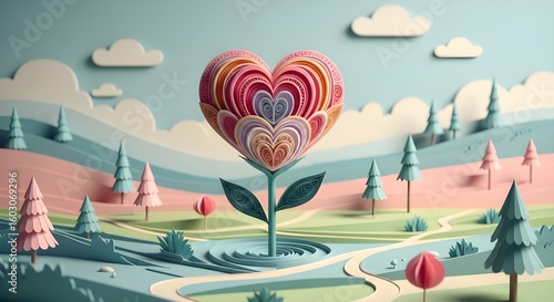 Paper heart flower in a pastel landscape with trees and clouds in a whimsical style design