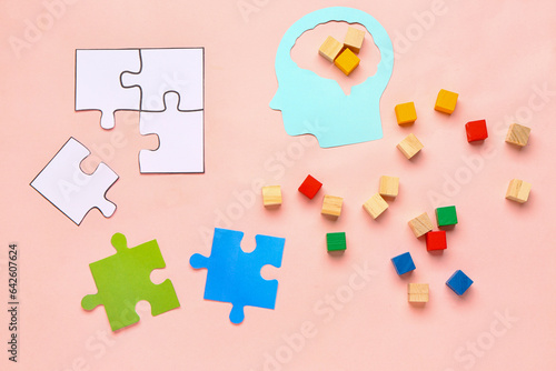 Paper human head with cubes and puzzle pieces on pink background. Logic concept