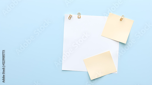 Paper notes with clip on light blue background, top view. Space for text. Generative AI