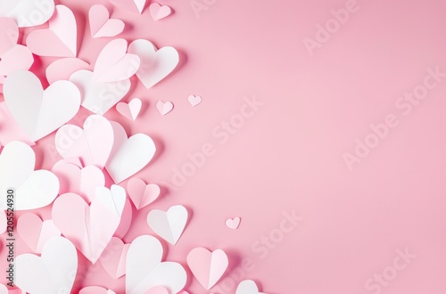 Paper pink hearts fly on soft pink color background, border, copy space. Valentine day concept for design.