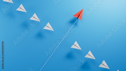 Paper planes with one red individual going in different directions.new ideas. paper art style. creative idea.3D rendering on blue background.