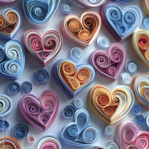 Paper quilling hearts in vibrant red, pink, and pastel tones on a white background, perfect for Valentine’s Day, anniversaries, wedding invitations, romantic decor, and crafting projects.