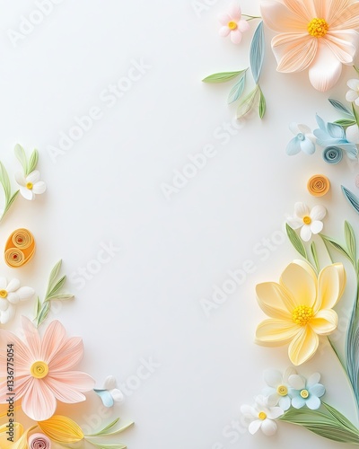 Paper Quilling Techniques Texture basket with pastel eggs, spring flowers, and blank space, perfect for Easter basket, Easter eggs, and Easter celebration card, Blank space for text.