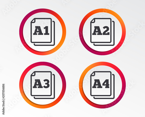 Paper size standard icons. Document symbols. A1, A2, A3 and A4 page signs. Infographic design buttons. Circle templates. Vector