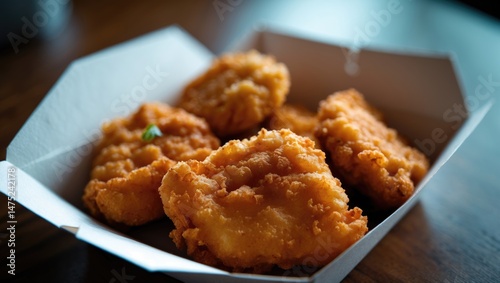 Paper take away box with fried chicken nugget representing fast food and unhealthy eating choices