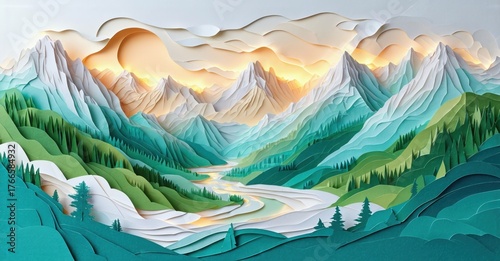 Papercraft mountains, river flows through valley. Soft colors create serene landscape, beautiful scenery.