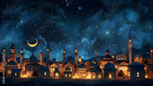 Papercraft of an Islamic Village: Houses and Mosques under a Starry Night Sky. Concept Islamic Art, Papercraft, Village, Starry Night, Buildings