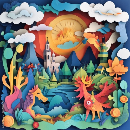 Papercut Whimsical Scenes with Mythical Creatures, Magical Landscapes, and Fairy-Tale Elements: Abstract Simple Minimal Joyful and Colorful 2D Layered Layout