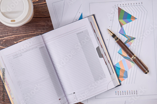 Paperwork concept, top view. Notepad, pen and disposable cup of coffee.