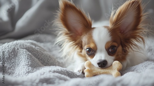 Papillon puppy gnawing on a small bone, highlighting suitable diet size for small breed dogs on a soft gray background.