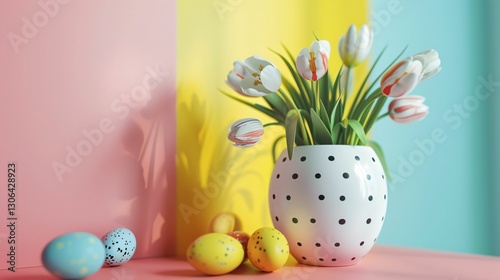 Pâques, lapin et œuf de Pâques, arrière plan, mock-up sur le thème de pâques, fond pastel coloré