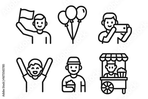 Parade line icon set. Public event celebration symbols. Onlooker waving flag, cheering crowd, balloons, taking photo with phone, eating popcorn, and street food vendor cart.