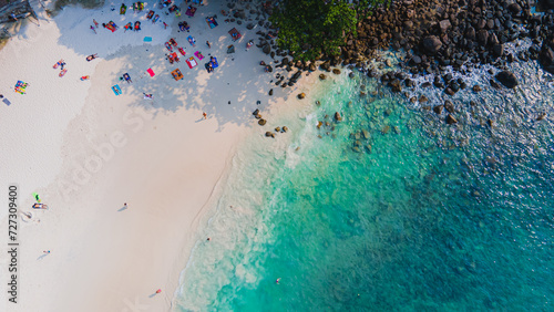Paradise beach Phuket Patong. aerial top view amazing freedom beach small white sand beach with perfect nature. white wave hit the rock around island. green forest peaceful. green sea, landscape.
