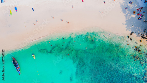 Paradise beach Phuket Patong. aerial top view amazing freedom beach small white sand beach with perfect nature. white wave hit the rock around island. green forest peaceful. green sea, landscape.
