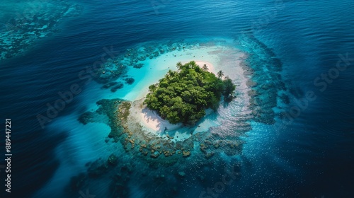 Paradise Found, Aerial View of Pristine Small Island with Vibrant Coral Reef Below in Crystal Clear Waters.
