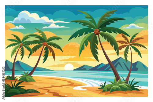 Paradise Palms: Capture the essence of a tropical paradise with a vibrant illustration featuring palm trees swaying gently on a sandy beach, under the warm glow of the setting sun.