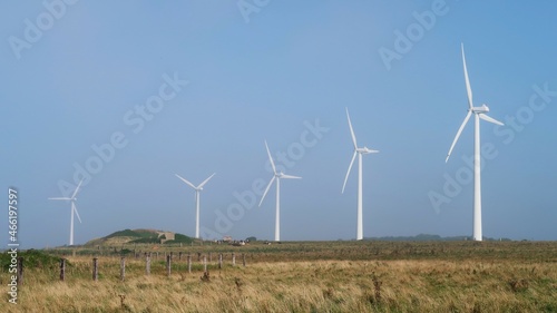 Parc éolien de cinq éoliennes, dans la campagne, à Fécamp en Seine-Maritime / Normandie (France)