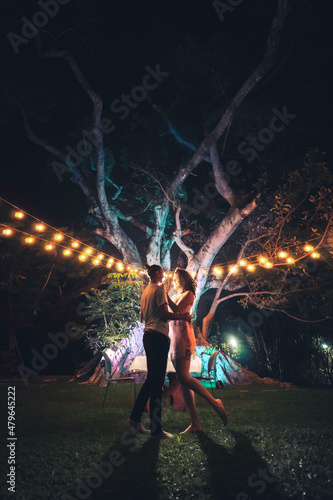 Pareja abrazada mirándose al anochecer frente a un árbol en una cita