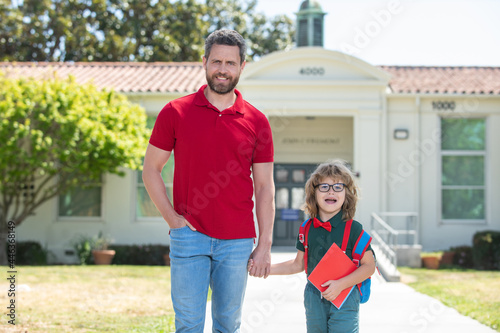 Parent and pupil of primary school go hand in hand. Teacher in t-shirt and cute schoolboy with backpack near school park.