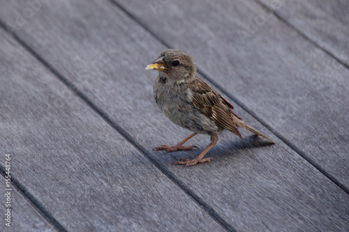 Parent female sparrow bird with dried bread food around beak