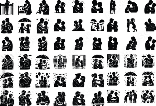 Parent Hugging Child Silhouette – Love & Family Bond Vector Set Mother or Father Hugging Kid Silhouette – Emotional Family Moment Design