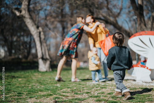 Parents and children gathered in a park share joyful moments, highlighted by the natural surroundings of trees and green spaces on a sunny day.