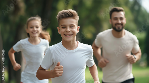Parents and children jogging together through a park, focus on fitness and happiness.