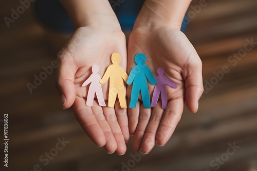 Parents and kid holding paper cutout of family in hands at turquoise wooden table, top view