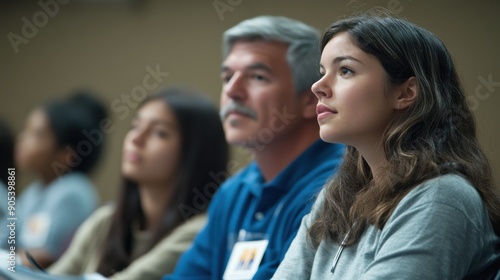 Parents and students at a college orientation, listening to presentations about academic programs and campus life, the atmosphere informative and welcoming, helping first-year students transition