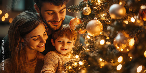 parents with children decorating a Christmas tree together in a cozy winter home, glowing fairy lights and festive ornaments creating warm family holiday atmosphere