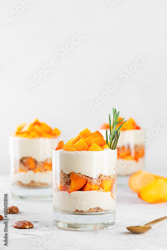 Parfait in a glasses with persimmon, rosemary, pecan, whipped cream and biscuit. Healthy food, vegan, sugar, gluten and lactose free.
