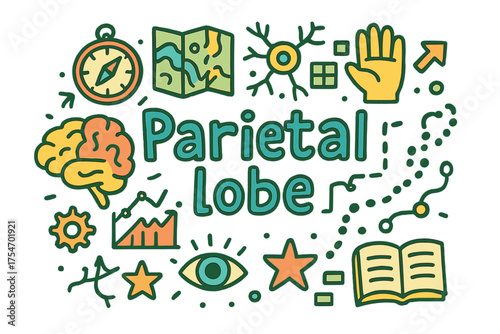 Parietal Lobe Doodle. Parietal lobe. Hand-drawn doodle illustration of Parietal lobe. Brain diagram, compass,